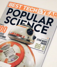 Boulder-based Sphero--which appears to have firmly hitched itself to what appears to be what might be the biggest, merchandising machine in history, Star Wars: The Force Awakens--resulting in a feature on the front cover of December's Popular Science. Sphero's BB-8 robotic ball is named one of "Today's 100 Greatest Innovations Of The Year" in the issue, which was released this week. Interestingly enough, the magazine also features an interview with the special effects artists who created the original BB-8 robot for the Star Wars film, who call the Sphero BB-8 just a "hamster in a ball" and say that the BB-8 used in the film is actually a "totally different beast". Sphero's BB-8 apparently came after the invention of BB-8 for Star Wars. Sphero's BB-8 was recently named one of the most searched-for toys by Google, and replicas of BB-8 are prominently featured in displays at Target and other retailers. BB-8 is also prominently featured in the latest issue of TIME, although that magazine's cover goes to R2-D2 instead.