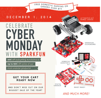 Gadget geek shopping alert! Among the local e-commerce retailers gearing up for the official launch of the holiday season is Boulder's SparkFun Electronics, which told its customers today that it is launching its biggest promotions this season on Cyber Monday. SparkFun said it will offer free domestic shipping on orders of $75, and up to 50% on some of the company's most popular products. SparkFun--which also has local retail locations--offers up a rich trove of electronic projects, parts, kits, and gadgets targeted at electronics enthusiasts and "makers".